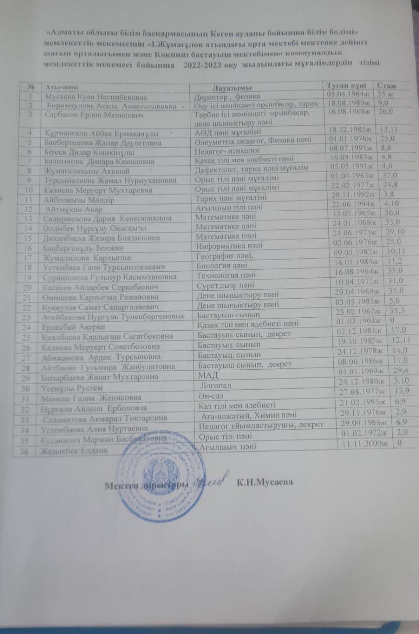 «Іңкәрбек Жұмағұлов атындағы орта мектебі мектепке дейінгі шағын орталығымен және Көкпияз бастауыш мектебімен» коммуналдық мемлекеттік мекемесінің 2022-2023 оқу жылындағы еңбек өтілі туралы тізім » 'Іңкәрбек Жұмағұлов атындағы орта мектебі