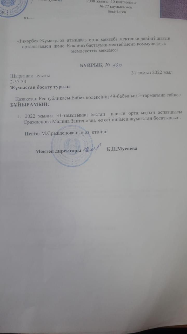Жұмыстан босату туралы 2022-2023 оқу жылы » 'Іңкәрбек Жұмағұлов атындағы орта мектебі